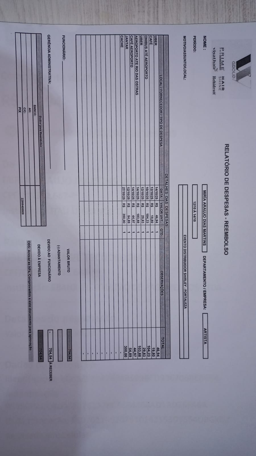 | 30/10/2025 | 31/10/2025 | PAGO | MIRIÁ ARAUJO DIAS MARTINS | EVENTO DISTRIBUIDORA SHIR... | PRIME PRO | CENTRO TECNICO | R$ 704,54 | R$ 704,54 | R$ 704,54 | R$ 0,00 | 🧾 | 📄 | |
