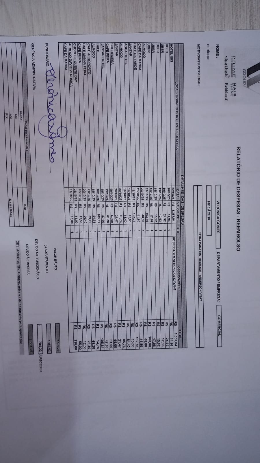 | 30/10/2025 | 31/10/2025 | PAGO | VERONICA GOMES DE AZEVEDO WHITAKER | FEIRA PARA DISTRIBUIDORES... | PRIME PRO | COMERCIAL | R$ 704,23 | R$ 704,23 | R$ 704,23 | R$ 0,00 | 🧾 | 📄 | |
