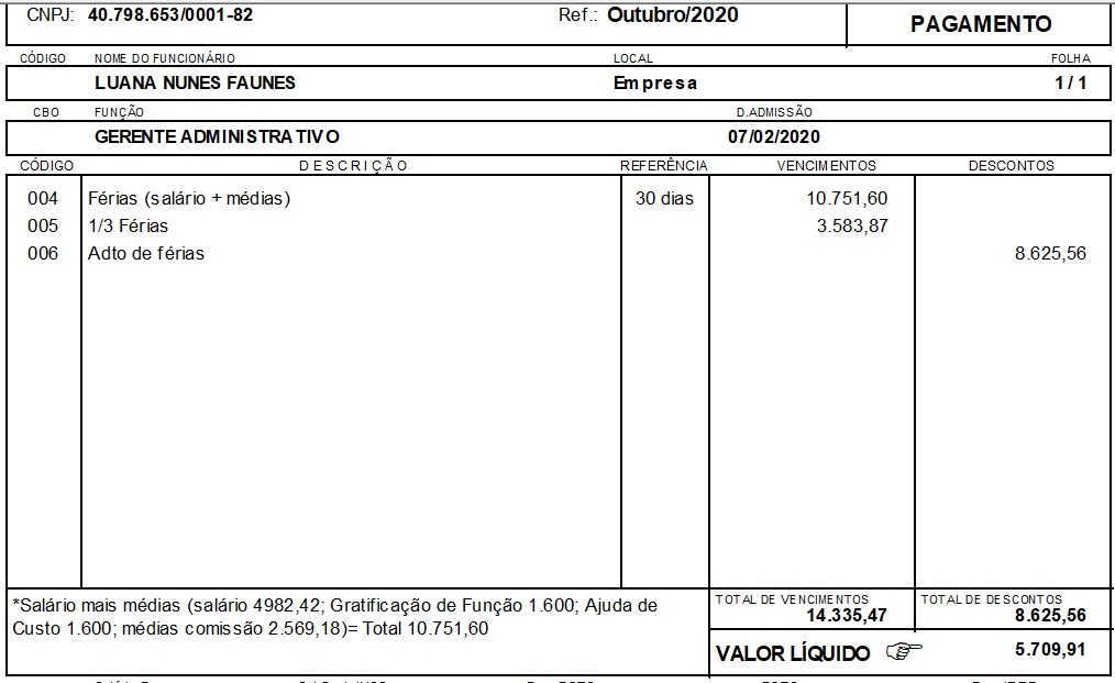 | 06/11/2025 | 06/11/2025 | PAGO | LUANA NUNES FAUNES | # DE FÉRIAS | ACADEMY | ADMINISTRATIVO | R$ 5.709,91 | R$ 5.709,91 | R$ 5.709,91 | R$ 0,00 | 🧾 | 📄 | |